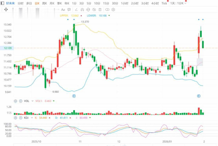 即使在去年12月15日和今年1月12日分别出现了一波冲击BOLL线上轨的走势,但均未观察到明显的成交量放大支持,也没有形成有效实体K线突破,在技术面上属于典型的BOLL线指标“假突破”,后续公司股价依旧在BOLL线中下轨震荡。