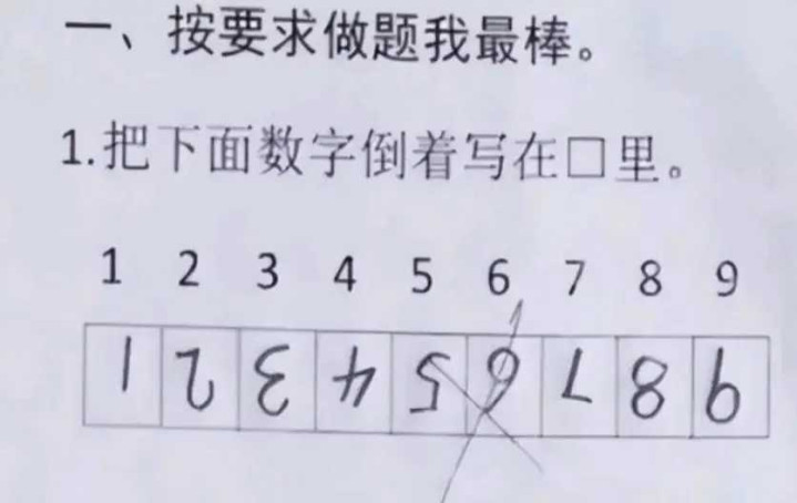 第一道数学题,题目要求把数字倒着写到方框里,人家还真就“倒着写”进去了。
