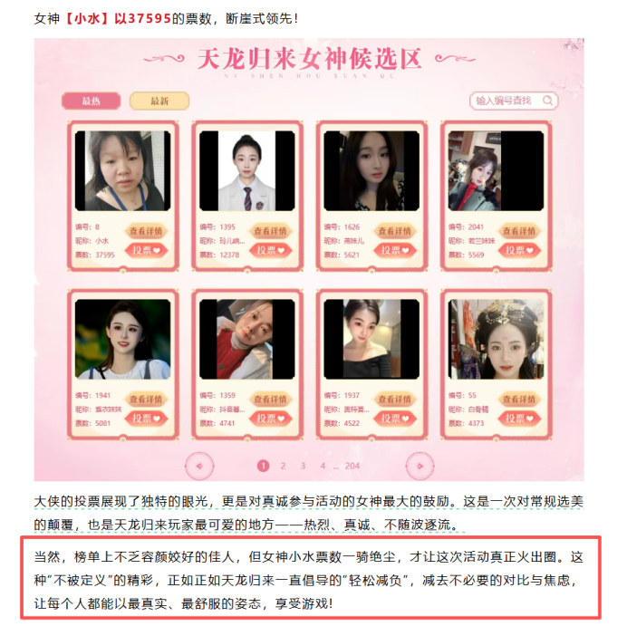 梗概历程是由玩家提交确切相片与材料,经由官方查对无误事后,再由整体天龙玩家投票选出东说念主气女神。