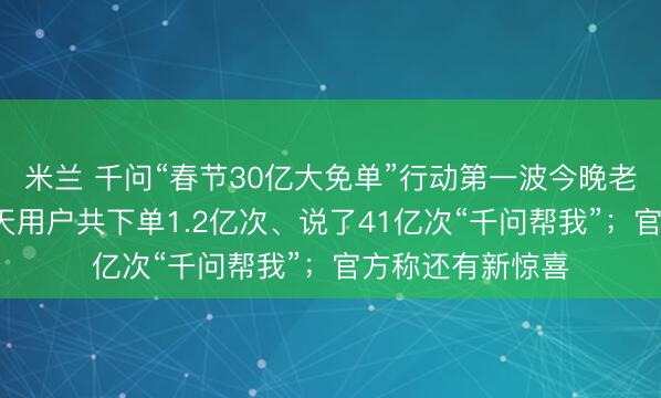 米兰 千问“春节30亿大免单”行动第一波今晚老成铁心,上线6天用户共下单1.2亿次、说了41亿次“千问帮我”;官方称还有新惊喜