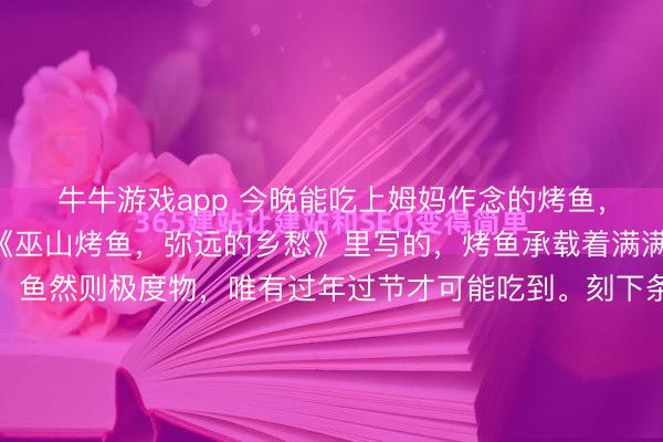 牛牛游戏app 今晚能吃上姆妈作念的烤鱼,几乎太幸福啦!就像《巫山烤鱼,弥远的乡愁》里写的,烤鱼承载着满满的亲情。已往在农村,鱼然则极度物,唯有过年过节才可能吃到。刻下条目好了,姆妈一样常就会给我作念