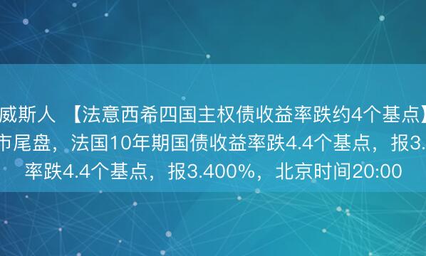 威斯人 【法意西希四国主权债收益率跌约4个基点】周二(2月10日)欧市尾盘,法国10年期国债收益率跌4.4个基点,报3.400%,北京时间20:00