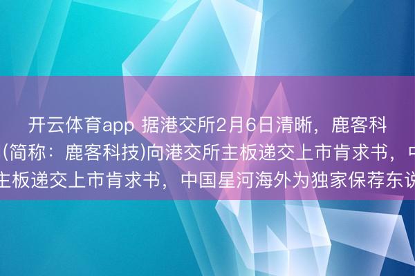 开云体育app 据港交所2月6日清晰,鹿客科技(北京)股份有限公司(简称:鹿客科技)向港交所主板递交上市肯求书,中国星河海外为独家保荐东说念主