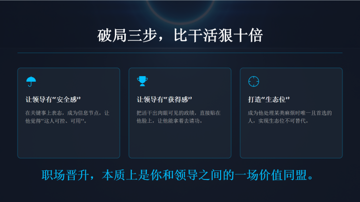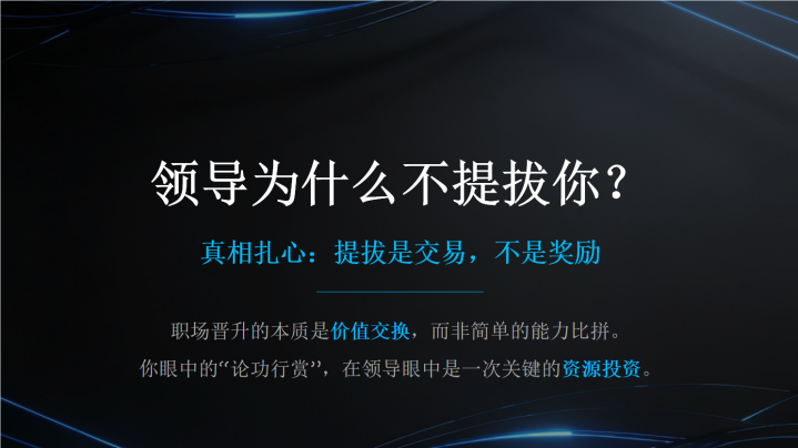 你的业务能力,只是本金。想让他追加投资(提拔你),你得证明,你还能带来远超业务的权力利息。真正的职场晋升,本质是与组织达成"价值同盟"——你帮助领导实现他的目标,他为你提供上升的阶梯,这不是交易的铜臭味,而是职场生态的生存法则。