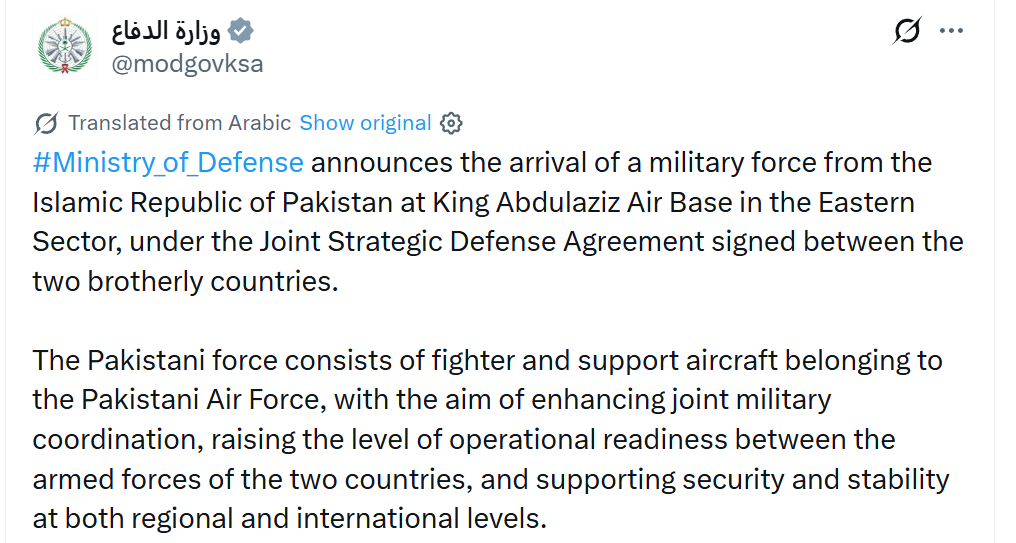 当地技能11日,沙特阿拉伯国防部在X平台上发表声明说,阐明细心契约,一支来自巴基斯坦的军事力量已抵达位于沙特东部地区的阿卜杜勒阿都兹国王空军基地。