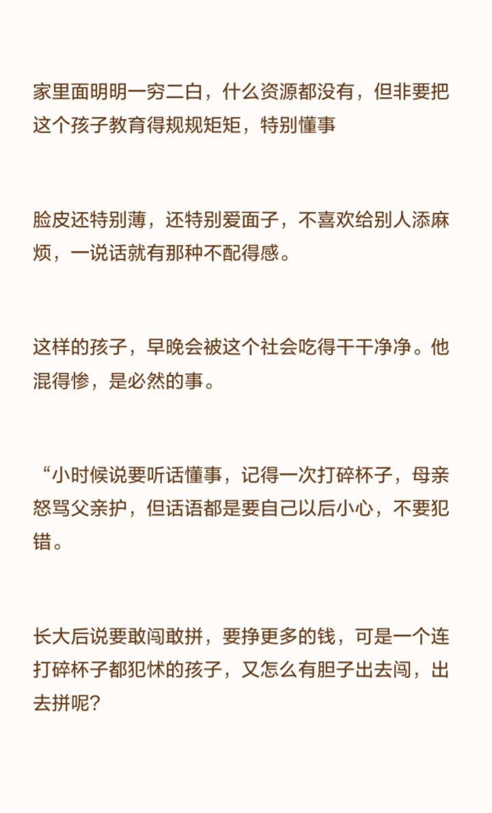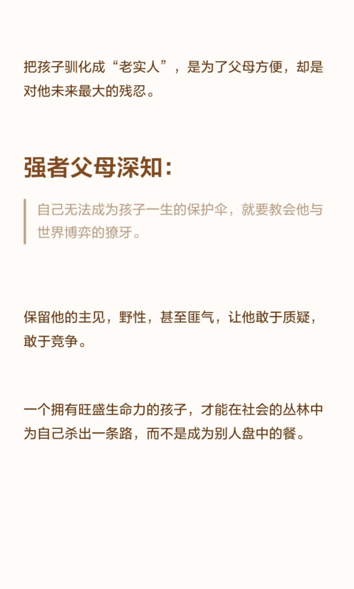 别让“为了你好”成为控制的借口,别让“老实听话”变成伤害的标签。那个偶尔会顶嘴、会反抗、会为了自己的权益据理力争的孩子,或许会让父母在当下觉得“难带”,但他拥有的是敢于面对世界的勇气和底气。这或许才是我们能给孩子的,最珍贵的礼物。