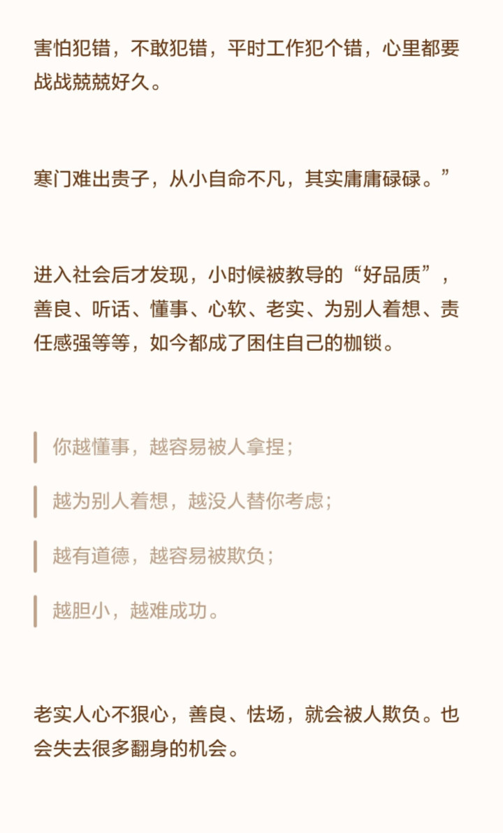 这种为了“省事”而进行的驯化,代价是巨大的。那个被训练得唯唯诺诺的孩子,可能会逐渐丧失表达愤怒和需求的勇气。他不敢在被欺负时大声说“不”,不敢在面对选择时说出“我想要”,甚至在长大后陷入职场霸凌或不良关系时,依然习惯性地逆来顺受。心理学研究表明,长期被要求“老实”的孩子,更容易形成讨好型人格,内心深处充满了自我怀疑,总觉得“我不够好”“我的感受不重要”。这种隐形的心理创伤,远比小时候的一次哭闹要严重得多。
