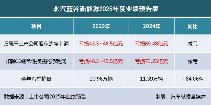2026年1月19日,北汽蓝谷新能源科技股份有限公司(证券代码600733)发布了2025年度业绩预告。预告显示,北汽新能源2025年归属于上市公司股东的净利润约亏损43.5亿-46.5亿元,与上年同期相比实现减亏。同时,扣除非经常性损益的净利润约亏损46.5亿-49.5亿元。