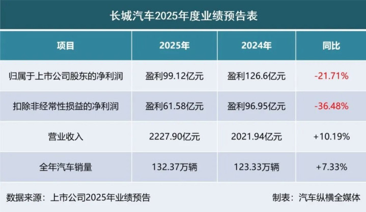 1 长城汽车:2025年净利润预盈99.12亿元,下降21.71%