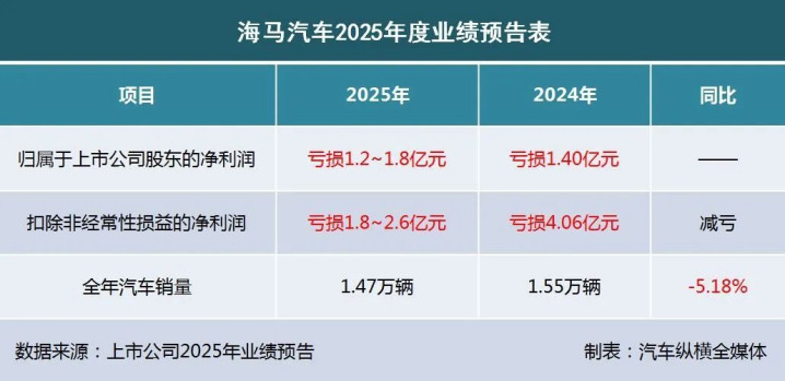 2026年1月29日,海马汽车股份有限公司(证券代码000572)发布了2025年度业绩预告。预告显示,海马汽车2025年归属于上市公司股东的净利润约亏损1.2亿-1.8亿元。同时,扣除非经常性损益的净利润预计亏损1.8亿-2.6亿元,与上年同期相比,将实现减亏。