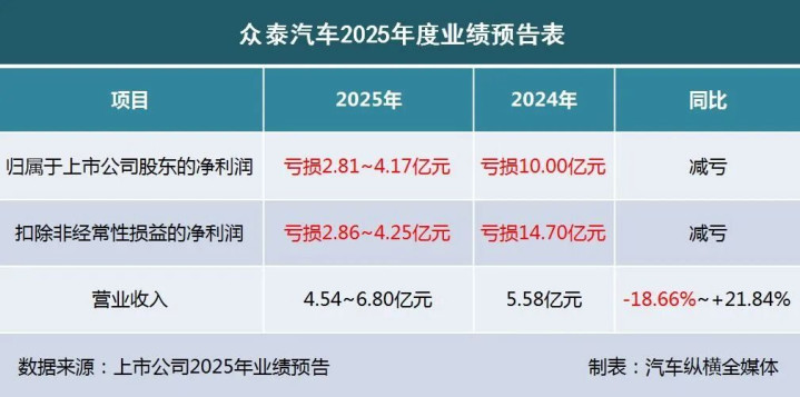 4 众泰汽车:2025年净利润预亏2.81-4.17亿元,减亏