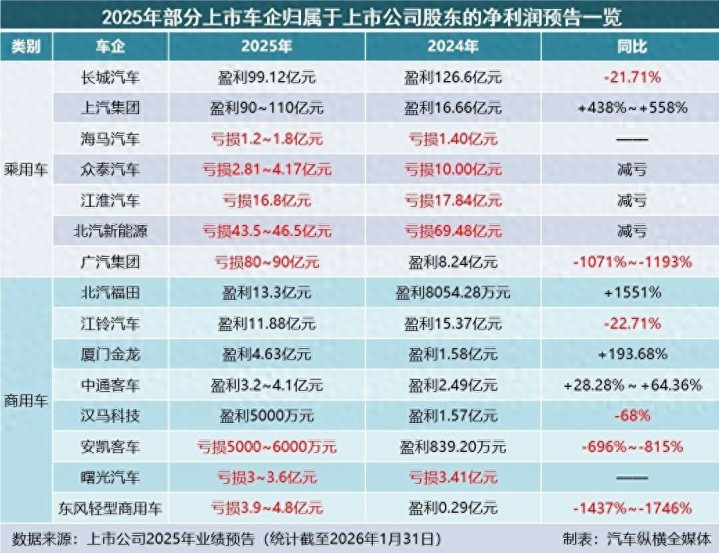 2026年1月,部分汽车类上市公司先后发布了2025年度的业绩预告。截至发稿前,中国汽车工业协会旗下汽车纵横全媒体跟踪到15家整车类上市公司,其中乘用车7家,商用车8家(比亚迪、长安汽车、赛力斯、一汽解放、中国重汽、宇通客车等主流车企尚未公布)。
