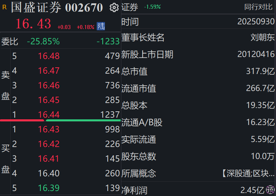截至2月2日收盘,国盛证券上涨0.18%,报16.43元/股,总市值317.9亿元。截至1月30日,公司股东户数为10.03万户。