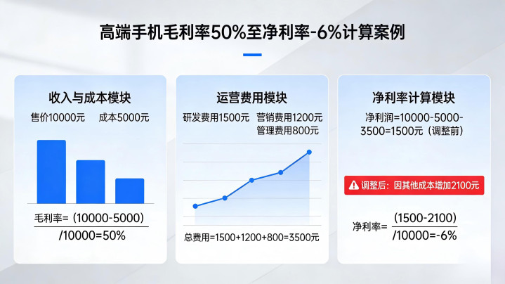 综合算下来,各种费用高达 1000+800+500+200=2500元,还没算税。最终 净利润 = 毛利(2500) - 总费用(2500) - 税费(300) = -300元。结果就是:毛利率高达50%,但净利率却是-6%,卖一部亏一部。