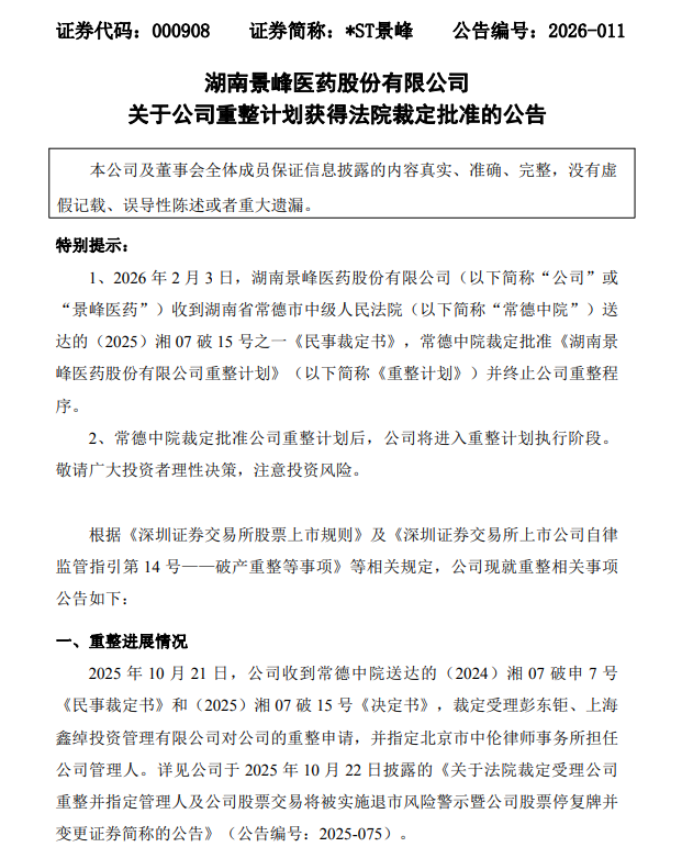 2月3日,*ST景峰(000908.SZ)公告称,2026年2月3日,公司收到湖南省常德市中级人民法院送达的《民事裁定书》,裁定批准《湖南景峰医药股份有限公司重整计划》并终止公司重整程序。常德中院裁定批准公司重整计划后,公司将进入重整计划执行阶段。若公司顺利执行完毕重整计划,将有利于改善公司资产负债结构及经营状况,提升公司持续经营和盈利能力。