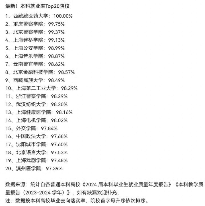 其中,西藏藏医药大学以100%的就业率稳居第一,实现了“人人有工作”的奇迹;重庆警察学院、北京警察学院紧随其后,就业率分别达到99.75%、99.37%,几乎全员就业;