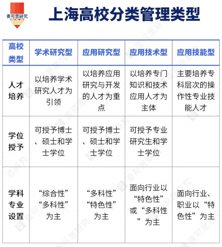 具体来看,上海按人才培养主体功能和承担科学研究类型,将高校划分为学术研究型、应用研究型、应用技术型和应用技能型四种类型;按学科专业设置和建设,划分综合性、多科性、特色性三种类型,形成“十二宫格”高校分类体系。