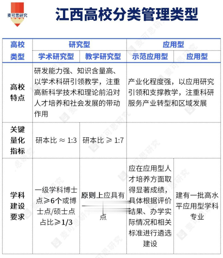 《实施办法》立足江西高校实际,将高校总体划分为“研究型”和“应用型”两个类型。“研究型”内分“学术研究型”和“教学研究型”,“应用型”内分“示范应用型”和“应用型”,最终形成“两型四类”的分类格局。