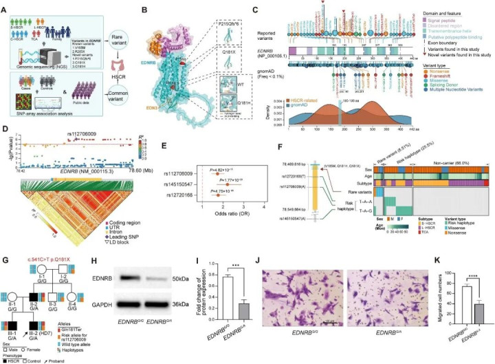 {jz:field.toptypename/}对一个携带p.Gln181Ter杂合变异的HSCR家系(HD7)进行的研究显示,该变异与疾病表型完全共分离(图1G)。研究团队利用基因编辑技术在人多能干细胞中模拟该基因型,并分化为肠神经嵴细胞(ENCC)进行功能实验。结果显示,p.Gln181Ter变异导致EDNRB在mRNA和蛋白水平的表达降低(图1H、I),并显著损害了ENCC的迁移能力(图1J、K),证明了该变异通过功能缺失机制参与HSCR发病。