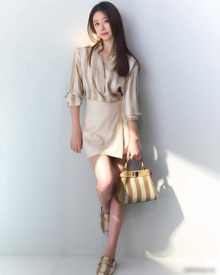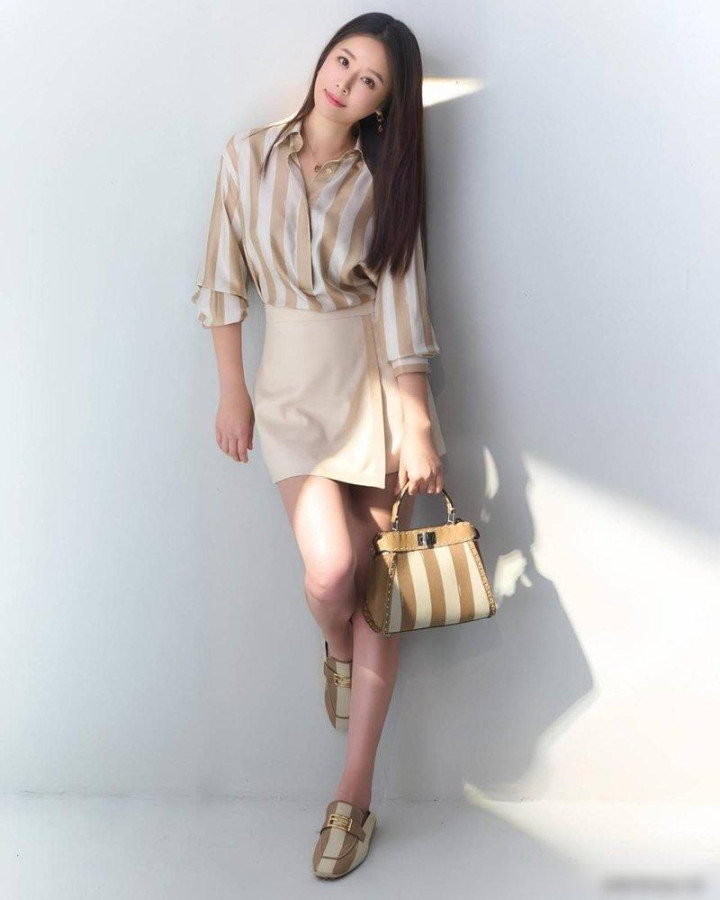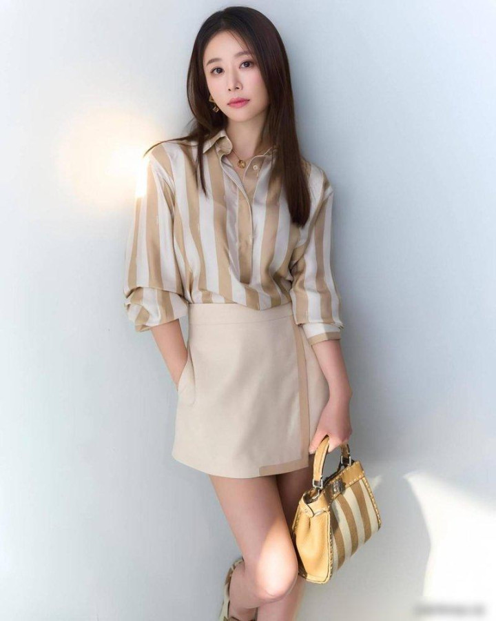 再说说条纹衬衫那套,卡其色混奶白的条纹软乎乎的,像办公室里刚泡好的热牛奶,温柔得没有攻击性;可下半身配A字超短裙,刚好盖过大腿最粗的地方,小腿露出来又细又长——这不是把“上班的耐心”和“下班的活力”绑一块儿了吗?好多姑娘怕这种穿法太“跳”?其实只要把握好“度”就行:上半身选修身或硬挺材质,下半身的裙子长度到大腿中部,就不会显轻浮;再比如配饰选白色大方包,装得下电脑又低调,比那些小废包实用一百倍。