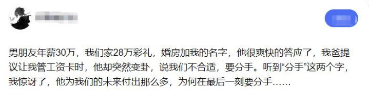 这也让我想起了最近看到的一篇帖,帖主说自己同事准备和年薪30W的男朋友结婚,提出了“28W彩礼+婚房加名字”的要求,男方爽快答应了。然后同事接着要求男方婚后必须上交工资卡,男方却突然不想结婚了,开始提分手。