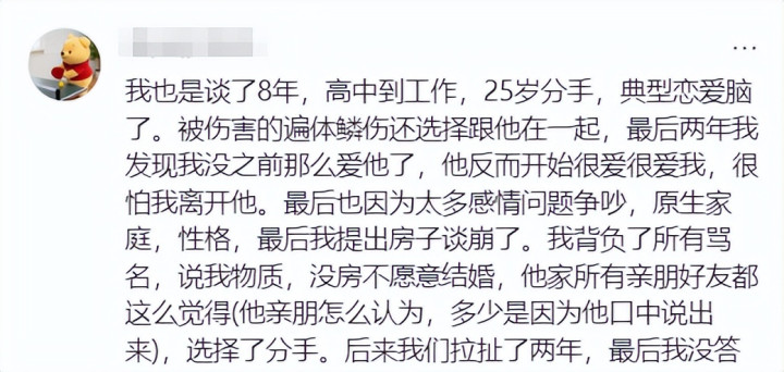 还有网友说自己也是走到结婚这一步谈崩了,本来都已经谈了8年的恋爱,从校园到职场,大家都已经工作稳定了。临到商议结婚之前,双方却因为买房的事情彻底谈崩,还被男方及其家人说太过物质,没房不愿意结婚。