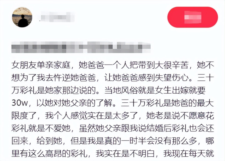 有网友表示自己也有类似的备婚问题,说她女朋友按照自己老家的风俗,开口就要30W的彩礼,自己家里实在拿不出来,但是女朋友说这是她爸爸的最低要求。要不是知道女朋友是单亲家庭,这个要价真觉得像在卖女儿。