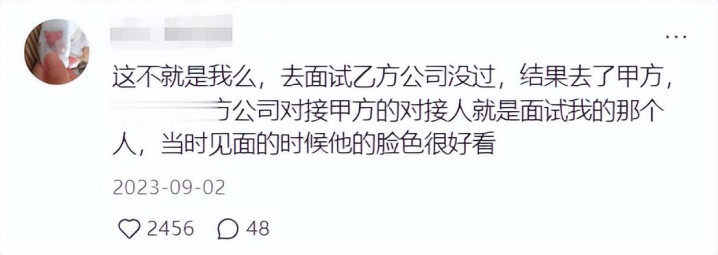 但是有些时候职场运气来了挡都挡不住,比如有网友在找工作时就曾遇到去面试乙方公司没过的情况,最后却去了甲方,而且乙方公司对接甲方的对接人就是面试网友的那个人。