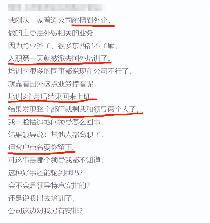咱就是说,这事儿搁谁身上能不慌张,于是帖主便私下问领导是什么情况,是不是工作保不住了,结果领导和他说:“其他人虽然都走了,但你可以留下,因为客户点名要你留下负责项目。”