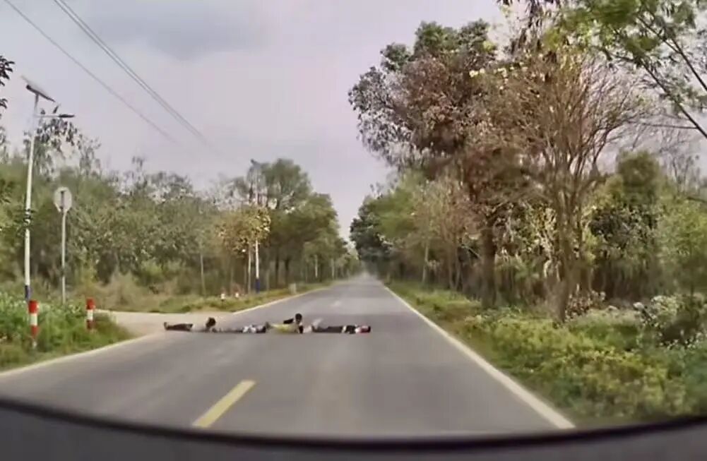 司机驾车途中遭逢4名儿童躺在马路上。
