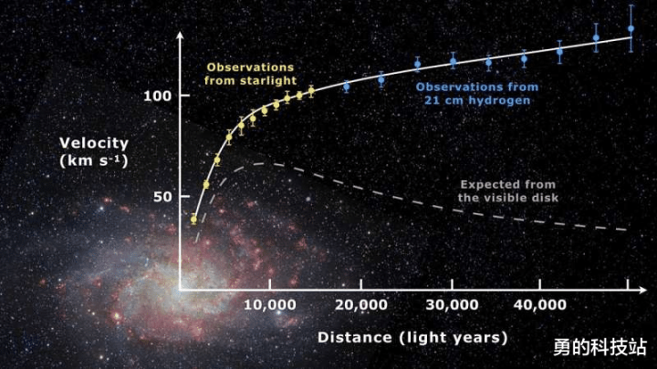 螺旋星系中的恒星在远离银河中心时以几乎恒定的速度绕行。图片来源:天文学:罗恩·凯利。M33:ESO