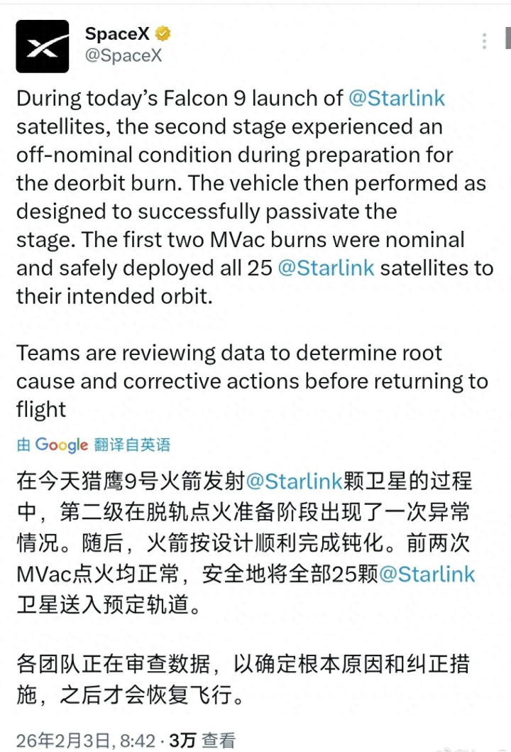 SpaceX官方突发通报!昨日(2月2日),该公司正式对外公布星链第17组第32批组网卫星(Starlink Group 17-32)发射任务详情,通报中明确提及,此次任务执行期间,猎鹰9号火箭二级在离轨点火准备阶段,出现了非正常运行状态,引发行业关注。万幸的是,尽管遭遇异常工况,火箭二级仍按预设完成钝化操作,且前两次真空梅林发动机点火均正常执行,最终成功将全部25颗星链卫星送入目标太阳同步轨道,任务核心目标圆满达成。