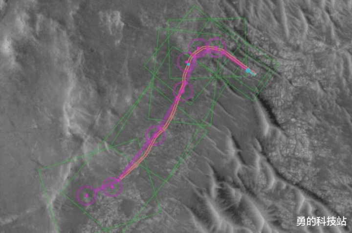 这张带注释的轨道图像展示了坚韧号火星车在杰泽罗陨石坑行驶时,AI规划(以品红色表示)和实际(橙色)航线。这次驾驶是两次展示中第二次展示生成式人工智能可以被纳入探测车路线规划。图片来源:NASA/喷气推进实验室-加州理工学院/亚利桑那大学