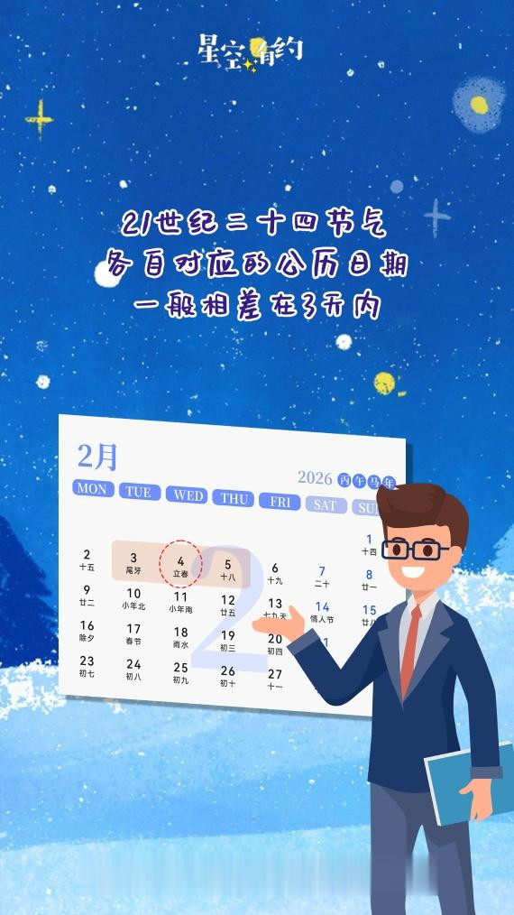 “公历纪年和二十四节气都反映地球与太阳的相对运动规律,因而基本上每一节气在公历年中的日期变动不大。”王科超说,比如,立春一般在2月3日至5日之间,清明一般在4月4日至6日之间,夏至一般在6月21日至22日之间。21世纪,二十四节气在公历中对应的日期一般相差在3天内。