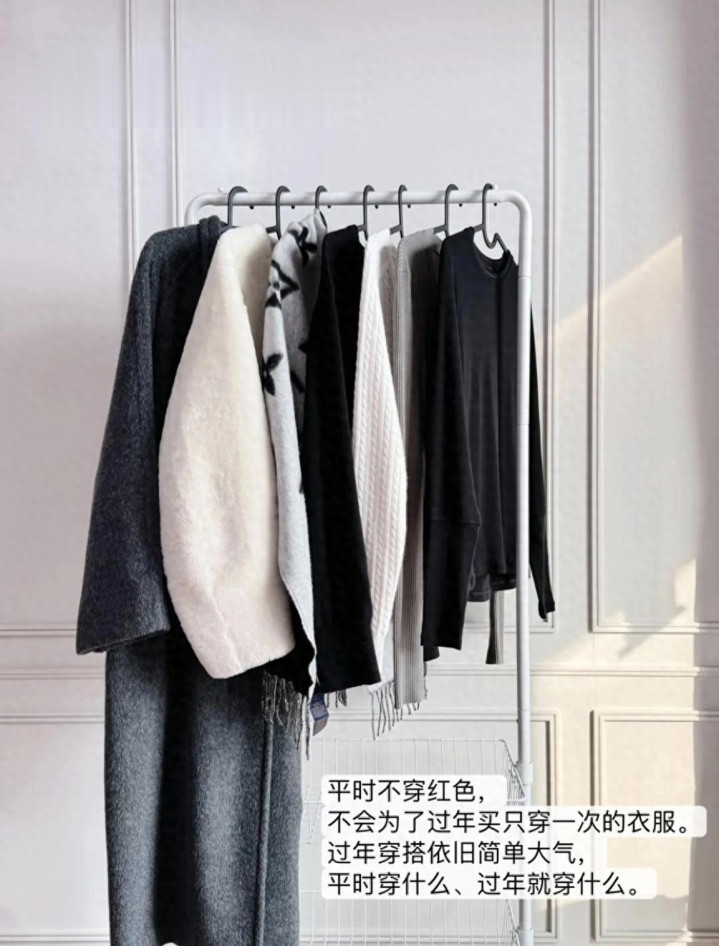 我平时穿红色很少,也不会为了过年去买节日款,衣服是穿给自己的,不是穿给节日的,平时穿什么风格,过年就穿什么风格。