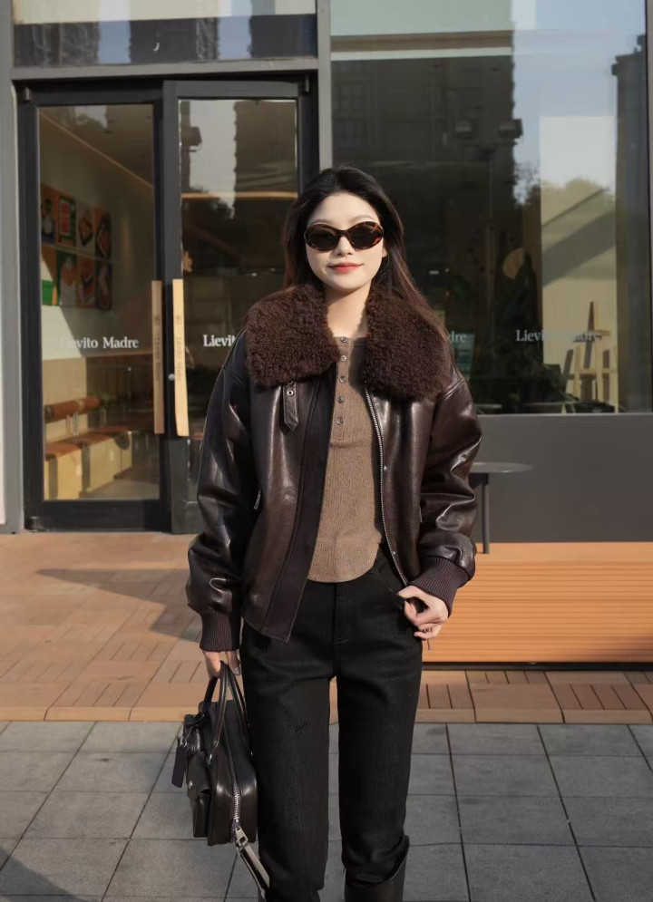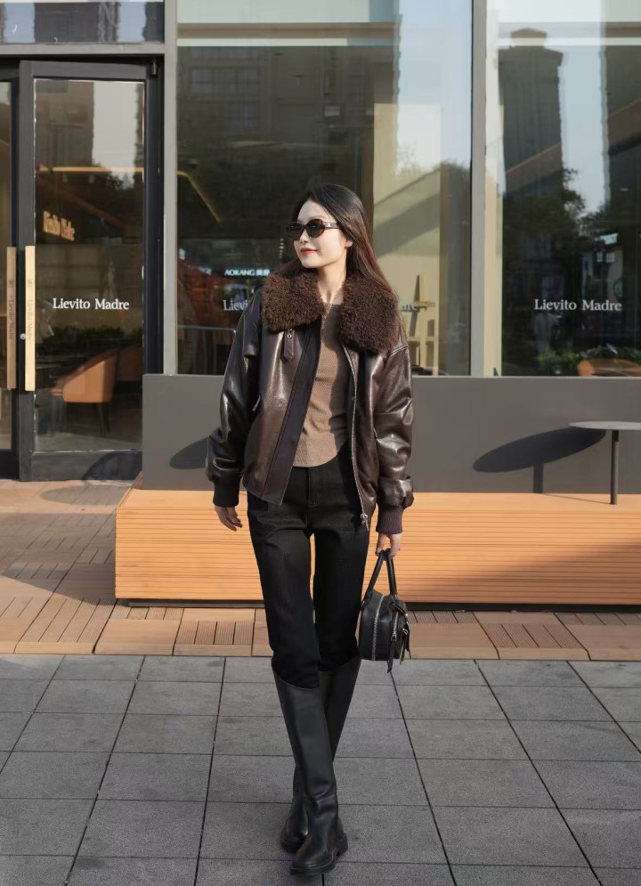 想酷一点?棕皮衣+小黑裤+黑靴子,复古飒爽,走路带风。