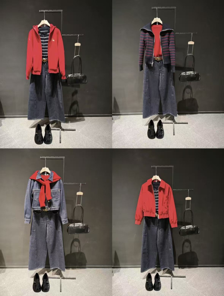 偶尔试试红黑拼接夹克+黑色丝绒阔腿裤+短靴,点睛之笔在鞋子,亮眼但不出格。