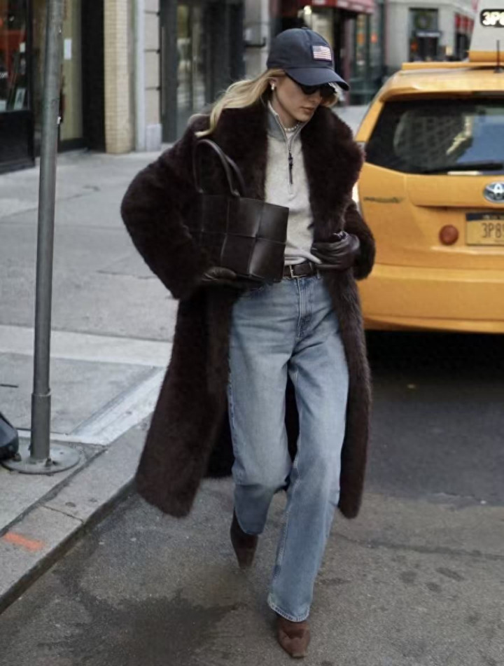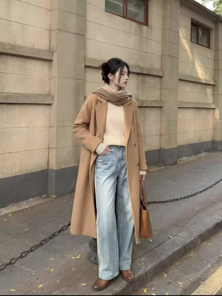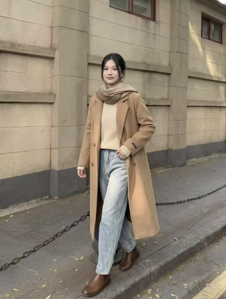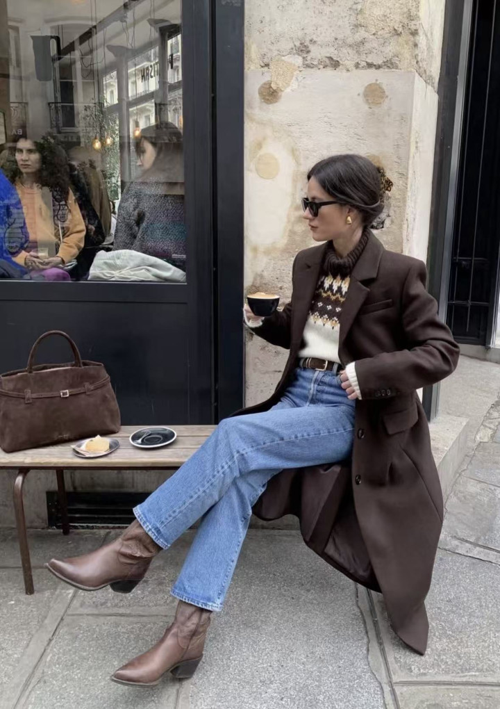 驼色大衣叠穿灰色针织开衫,配米白牛仔裤和棕色短靴,法式松弛感拿捏了。
