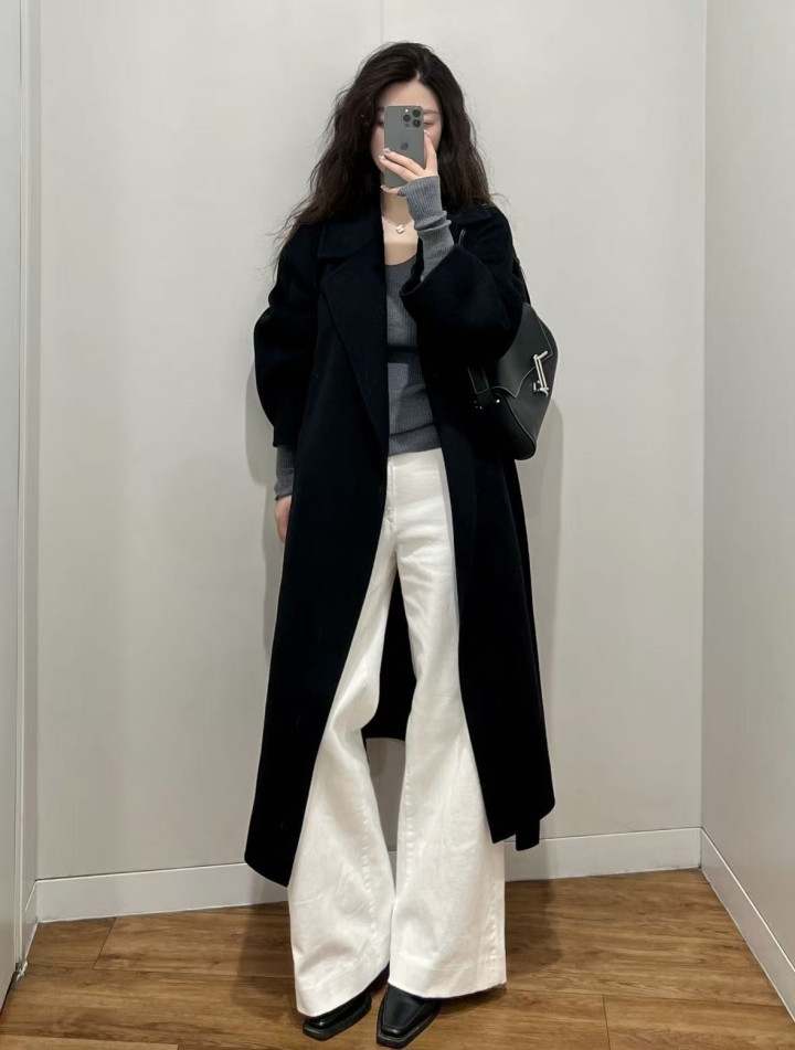 黑色大衣+小白裤是经典黑白配,简洁大气,搭配同色短靴更显腿长。
