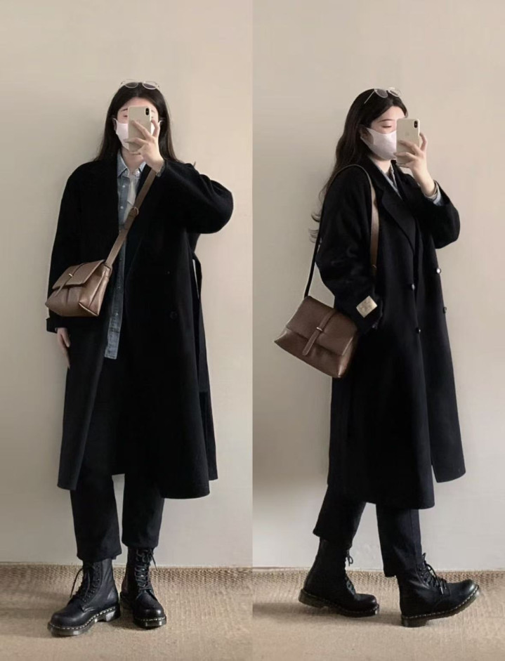 黑色大衣+小黑裤+马丁靴,气场全开,穿去开会都没人敢废话。