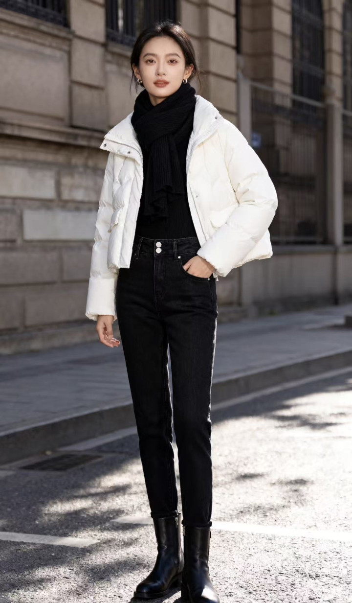 高个子姐妹试试全身黑:黑色长羽绒服+黑毛衣+九分牛仔裤+黑短靴,显高显瘦一套齐活,冬天裹成粽子也不怕胖。