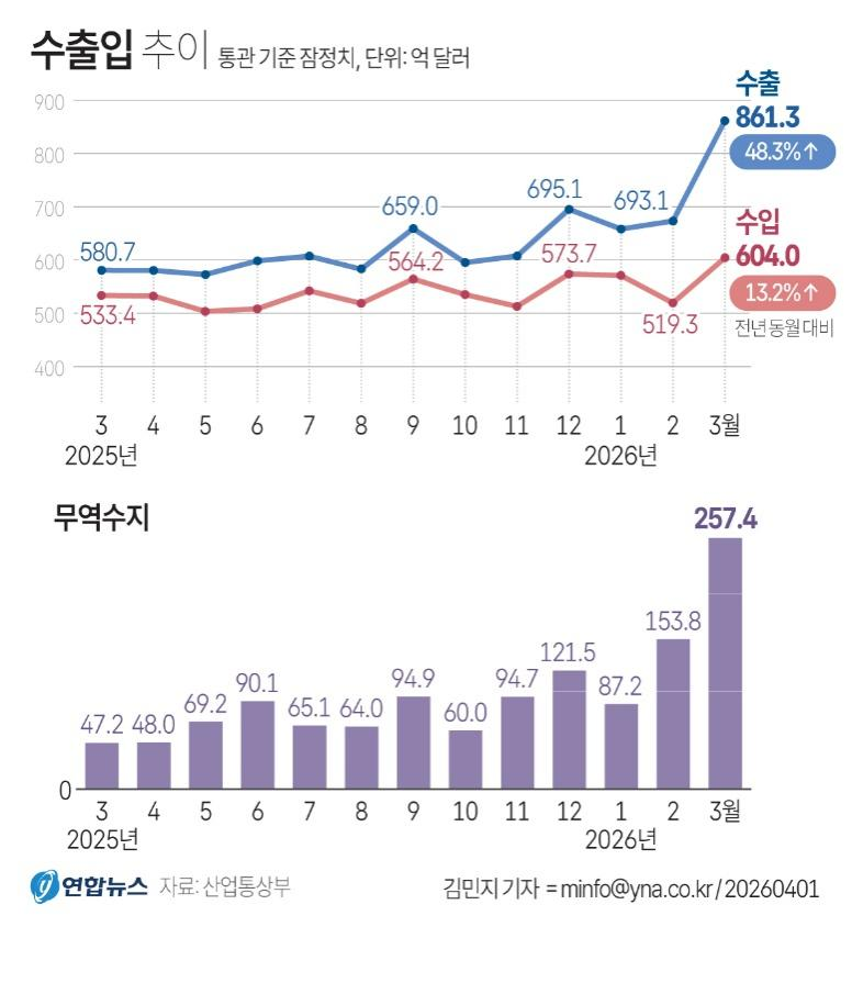 韩国产业互市部数据,韩联社制图,折线图蓝线为出口,红线为入口,单元为亿好意思元。紫色柱状图为交易额。