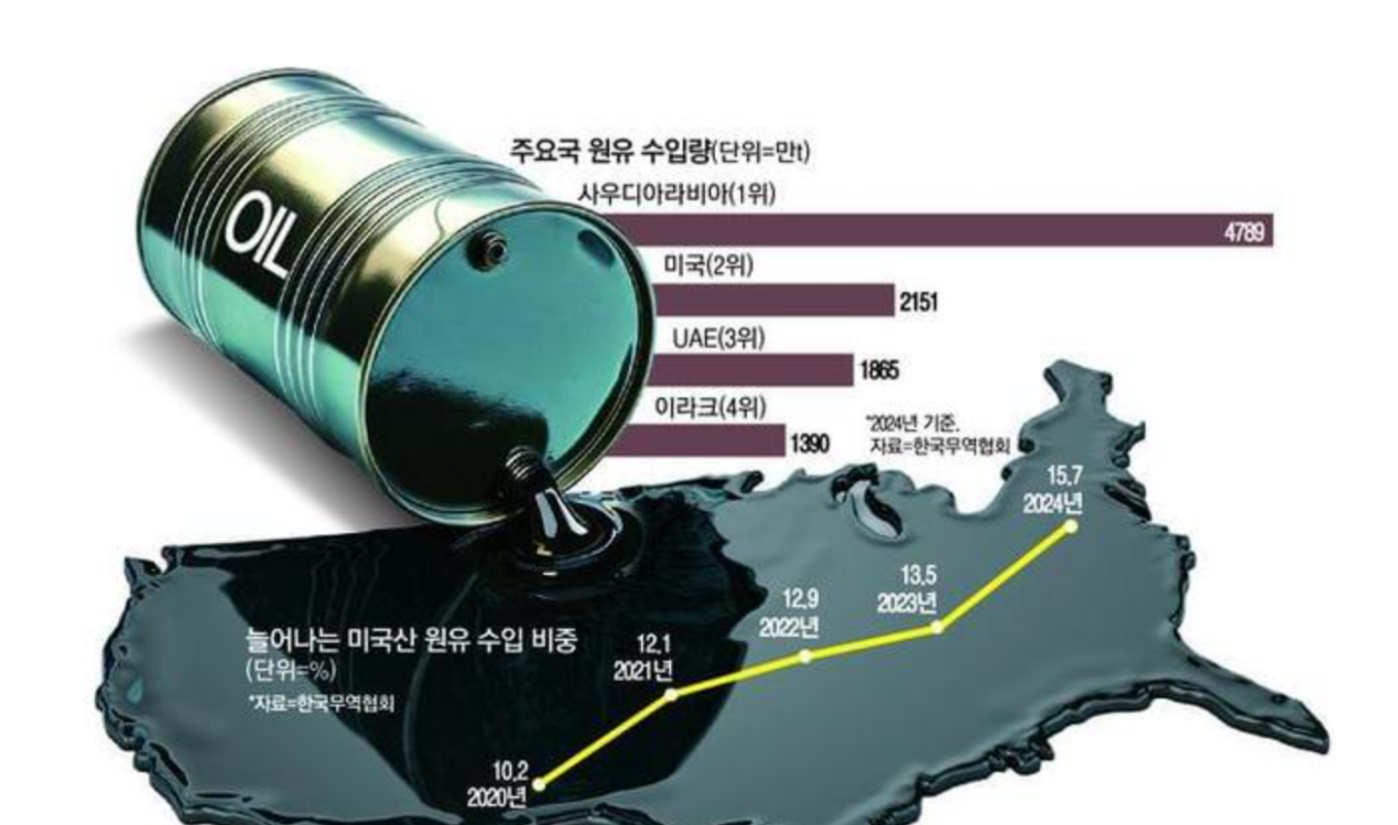 上方是韩国主要输入原油的着手国和限度,沙特阿拉伯以4789万吨位居首位。下方黄线则是韩国入口好意思国原油的比重,2024年还是升迁到15.7%。